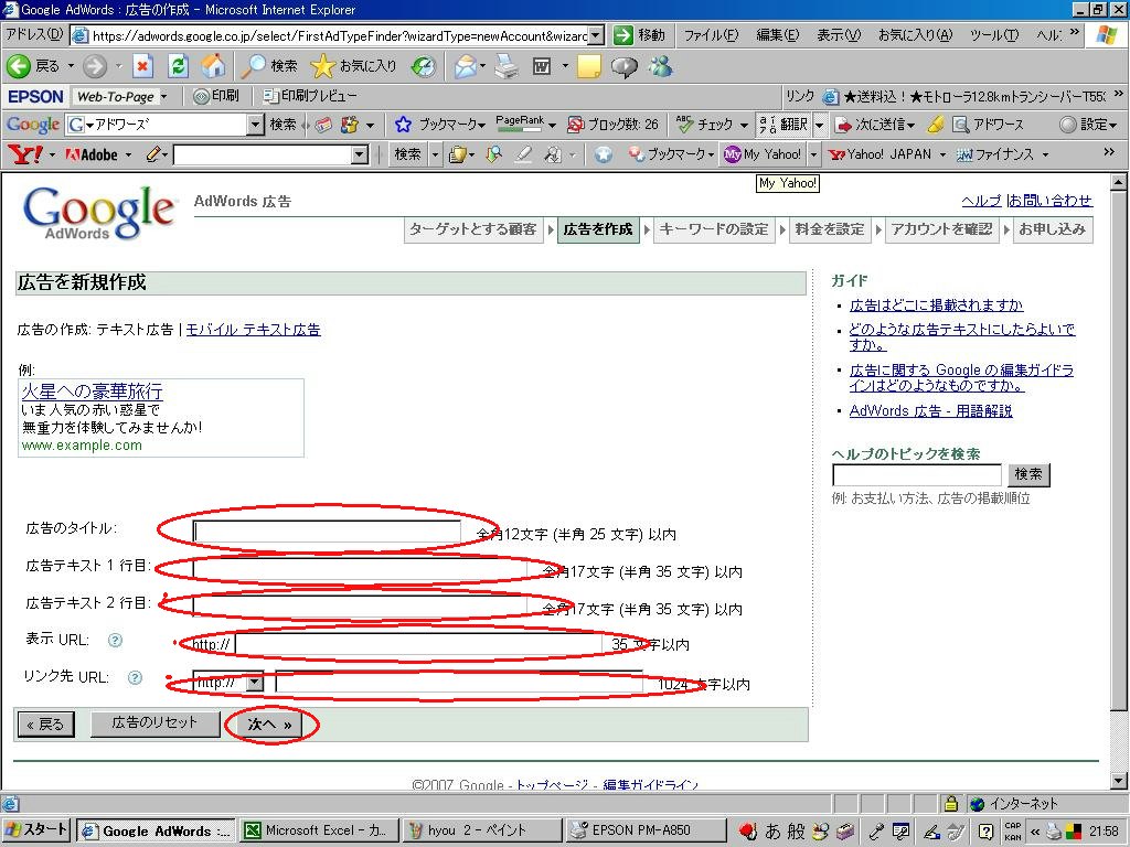 ナビに従い、広告のタイトル(サイト名)、広告のテキスト1行目、2行目、URLを埋めていきます。